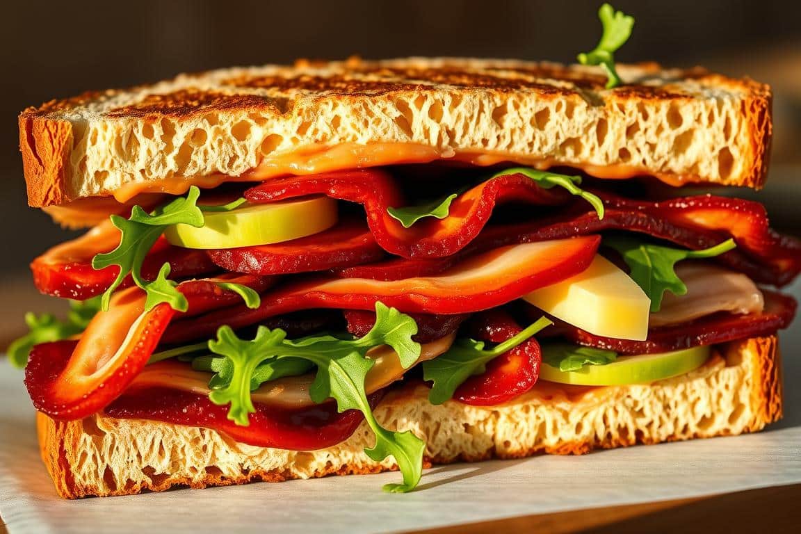 I recently discovered a delightful twist on traditional turkey sandwiches that has become a staple in my holiday gatherings: the Applewood Smoked Turkey Melt with Cranberry Whiskey Glaze. This gourmet sandwich combines the rich flavors of applewood-smoked turkey, cranberry sauce infused with whiskey, and melted cheese on whole wheat bread.