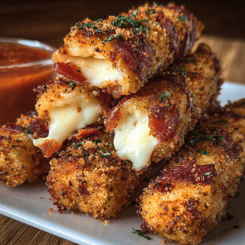 Crispy bacon-crusted mozzarella sticks with a golden coating and gooey melted cheese center. Perfect appetizer for parties, game nights, and family gatherings.