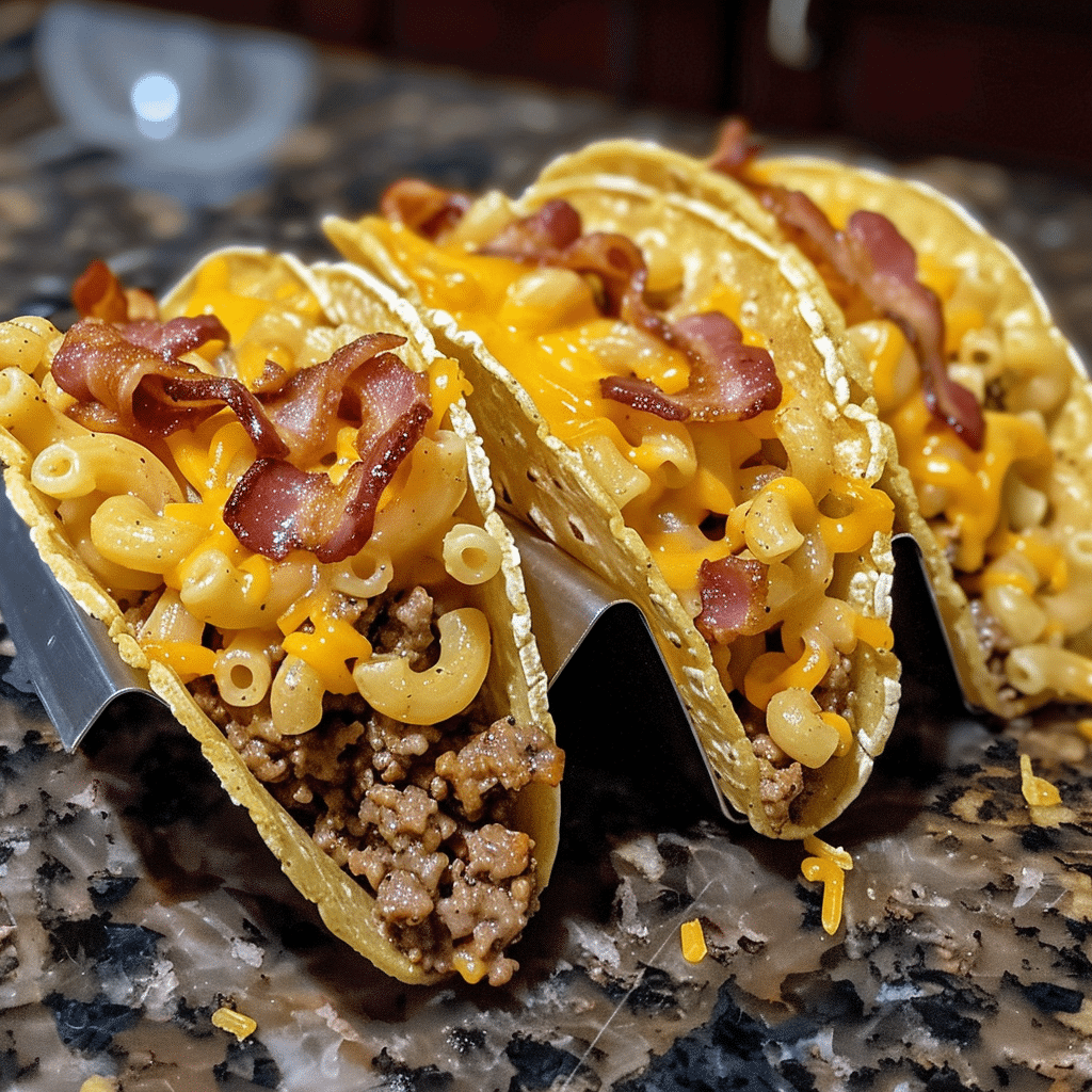 Indulge in the ultimate comfort food fusion with these Bacon Macaroni Cheeseburger Tacos. Crunchy taco shells filled with creamy macaroni and cheese, topped with juicy bacon and all your favorite cheeseburger toppings.