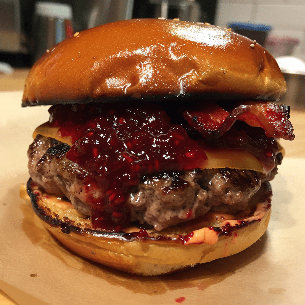 A delicious fusion of flavors, the Bacon Raspberry Swirl Burger combines the savory taste of crispy bacon with a sweet and tangy raspberry sauce, all atop a juicy burger patty. Perfect for summer BBQs!