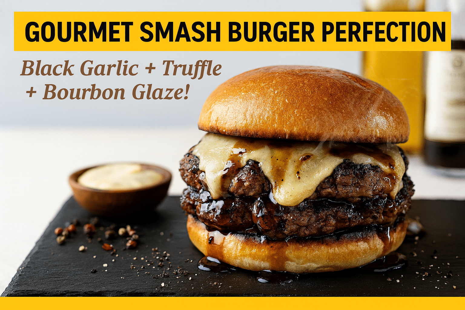 The Black Garlic Truffle Swiss Smash Burger is a gourmet twist on the classic smash burger, featuring high-quality ingredients like black garlic, truffle oil, and Swiss cheese, topped with a Bourbon Peppercorn Glaze.