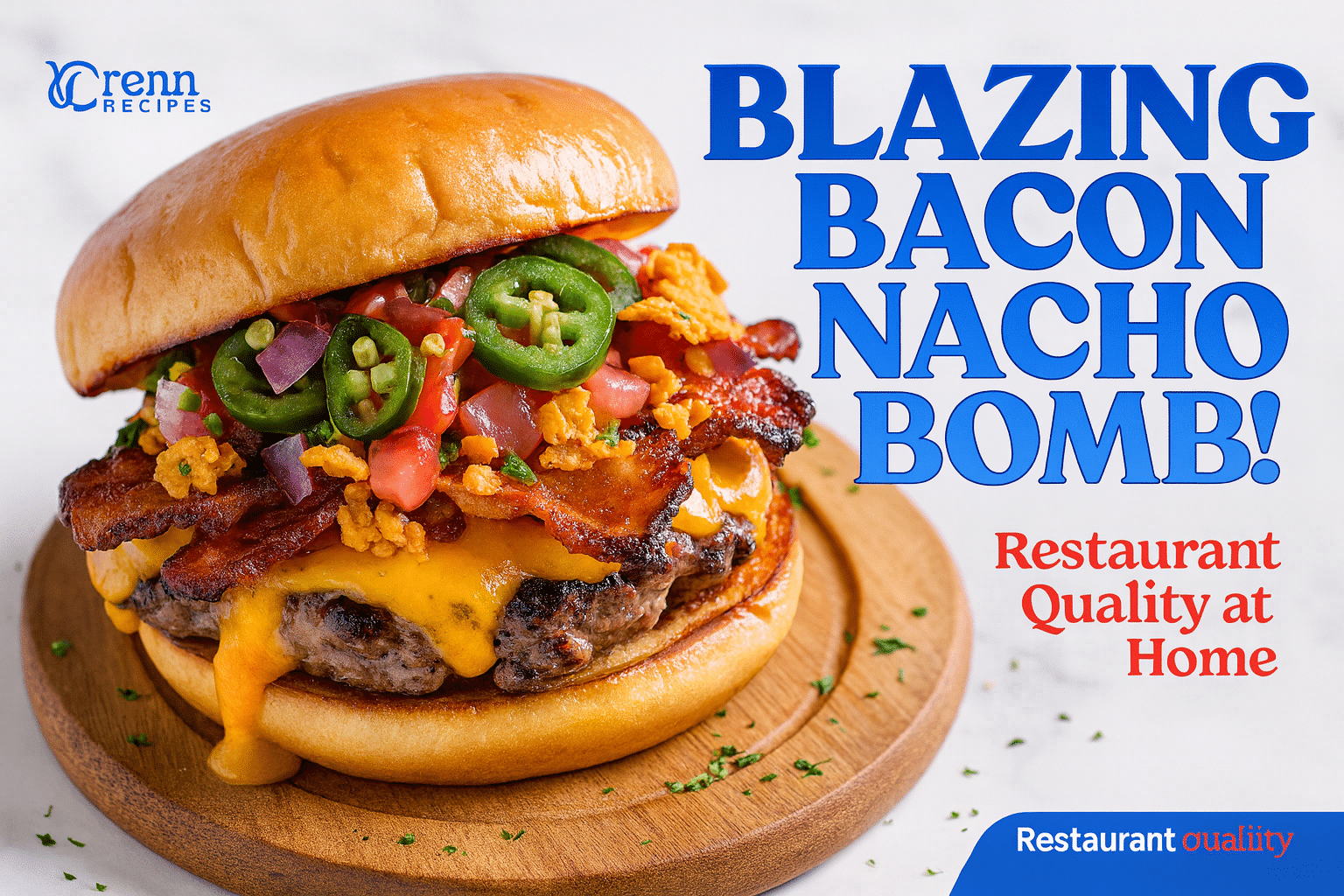 The ultimate blazing bacon nacho bomb burger featuring perfectly seasoned beef patties, crispy bacon, melted cheddar, fresh jalapeños, and signature tortilla chip crunch. Crafted for discerning home chefs seeking restaurant-quality burger perfection with bold flavors and gourmet presentation.