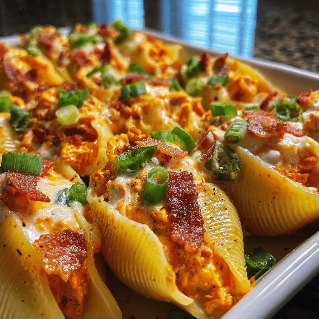 Delicious Buffalo Chicken Bacon Ranch Stuffed Shells combining spicy buffalo chicken with creamy cheese and crispy bacon. Perfect comfort food using leftover chicken, these stuffed pasta shells are baked to golden perfection with a rich, savory filling.