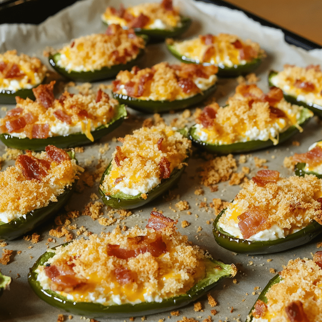 Preheat your oven to 375°F (190°C). Fill the jalapeño halves with the creamy, cheesy bacon mixture, pressing it in gently to ensure it’s evenly distributed. Arrange the stuffed jalapeños on a baking sheet and sprinkle with the panko breadcrumbs, giving them a light coating.