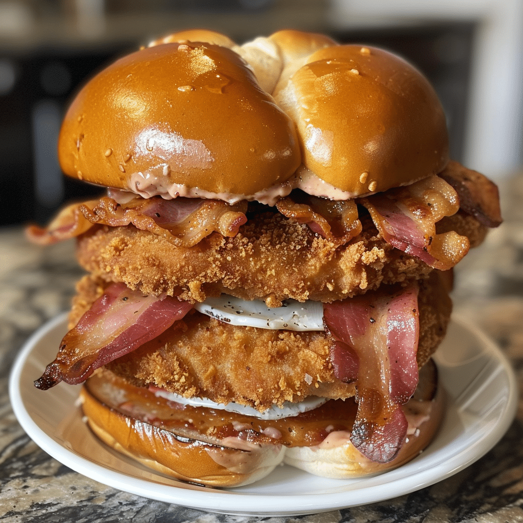 A delicious sandwich that combines crispy schnitzel, savory bacon, and soft pretzel bread, topped with your favorite condiments for an unforgettable meal!