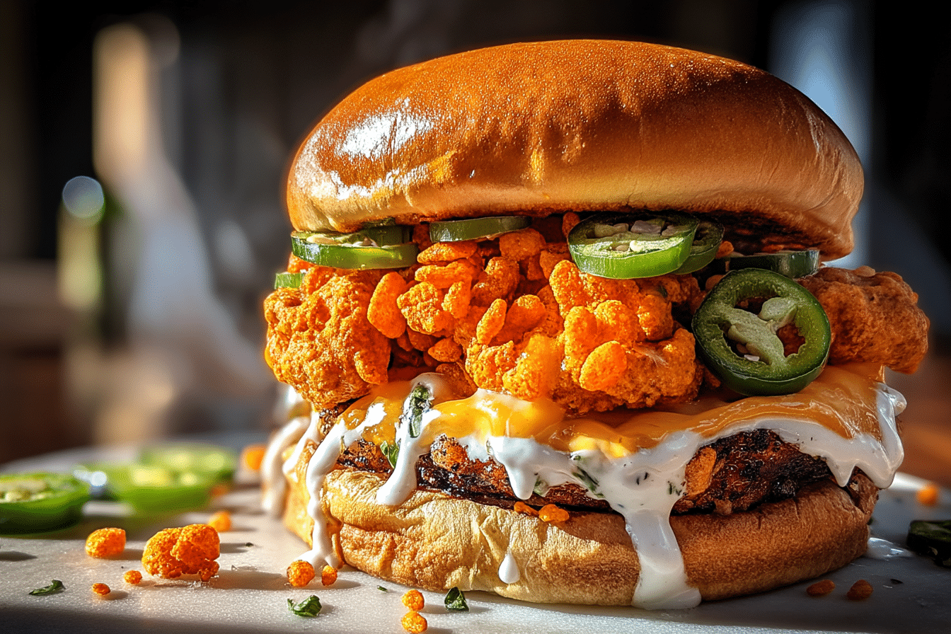Experience the ultimate fusion of crispy Cheetos coating, juicy protein, and cooling jalapeño ranch in this show-stopping spicy burger that delivers restaurant-quality heat and flavor at home.