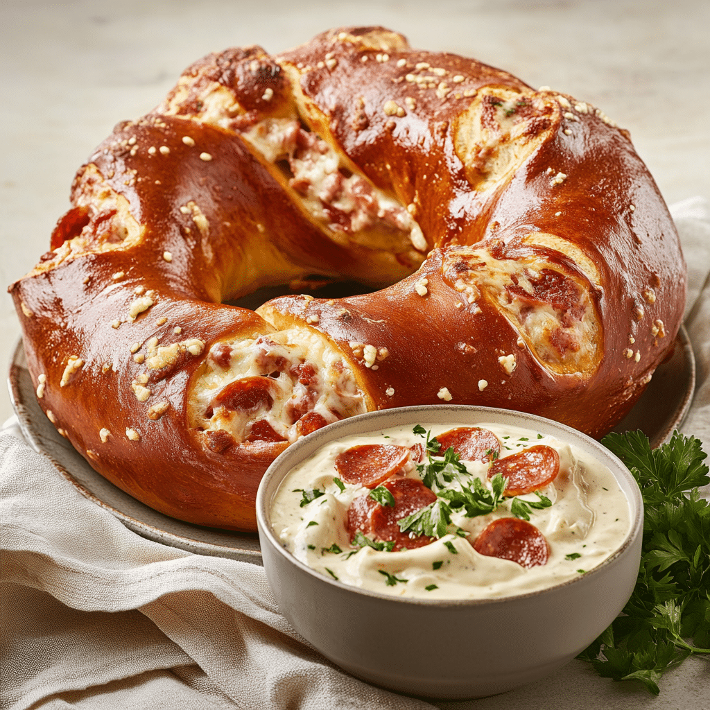 Indulge in the ultimate comfort food with this Giant Stuffed Pizza Pretzel, served with a rich and creamy Pepperoni Cheese Dip. Perfect for gatherings or a cozy night in.