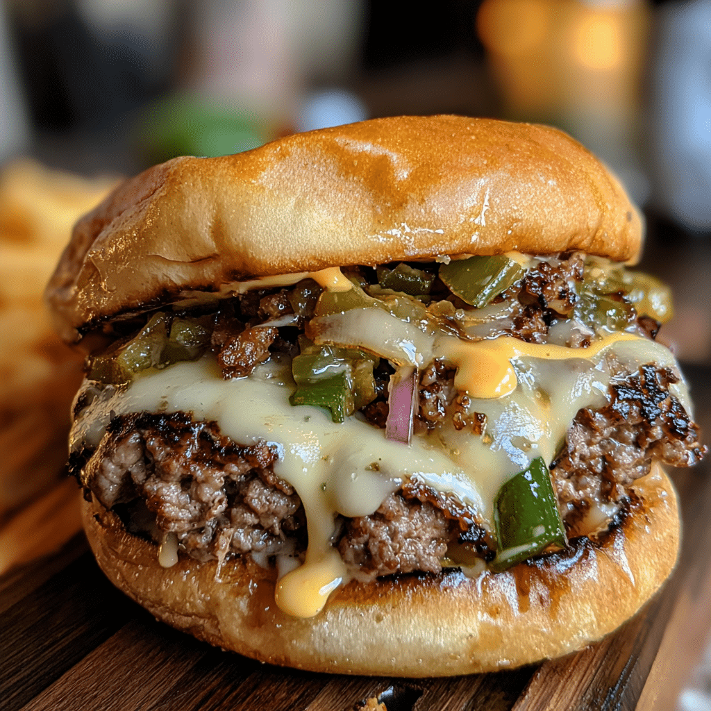 The Ultimate Philly Cheesesteak Smash Burger combines tender ground beef, smoky bacon, and spicy jalapeños with a rich beer cheese pour-over. This gourmet burger features griddled onions and peppers, creating a memorable dining experience that elevates your burger game.