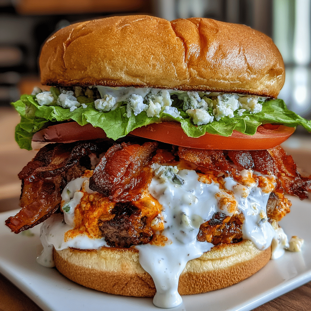 Bold flavors collide in this restaurant-worthy Buffalo Bacon Blue Cheese Smash Burger with Buttermilk Ranch Flood. Crispy-edged ground chicken patties are glazed with spicy buffalo sauce, topped with tangy blue cheese crumbles and smoky bacon, then drizzled with cooling buttermilk ranch. The smashing technique creates perfect texture contrast – crispy exterior giving way to tender, juicy meat that holds up beautifully to bold toppings.