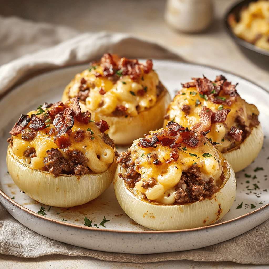 - Herb Garnish: Finish the Loaded Bacon Mac Cheeseburger Stuffed Onion Bombs with a sprinkle of fresh parsley, chives, or thyme for an elegant, aromatic touch.