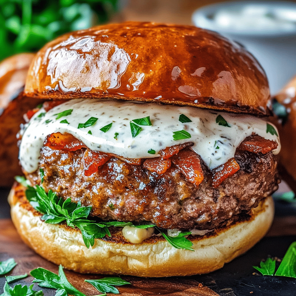 Allow the meatloaf to rest for 5-10 minutes before slicing. Serve the Maple Bacon Ranch Smashburger Meatloaf on soft, pillowy buns, topped with a dollop of creamy ranch dressing and a sprinkle of freshly chopped parsley or chives for a beautiful presentation.