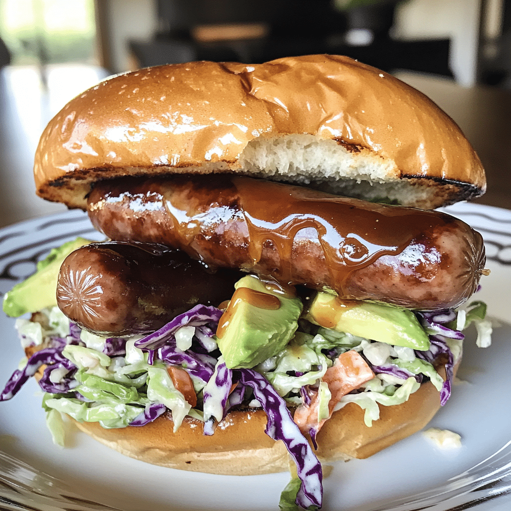 Now it’s time to assemble this epic sandwich! Grab your soft, toasted buns and layer on the maple bourbon glazed bratwurst, followed by a generous helping of the crunchy slaw mixture. Finish it off with an extra drizzle of the honey mustard dressing, and get ready for the ultimate flavor explosion!