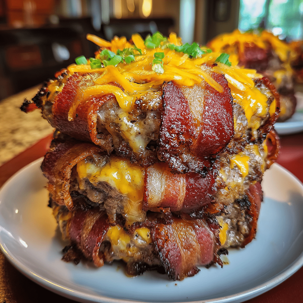 I built this stacked centerpiece to satisfy my carnivore cravings with crisp bacon, molten cheese, and juicy beef in a bold, attention-grabbing presentation.