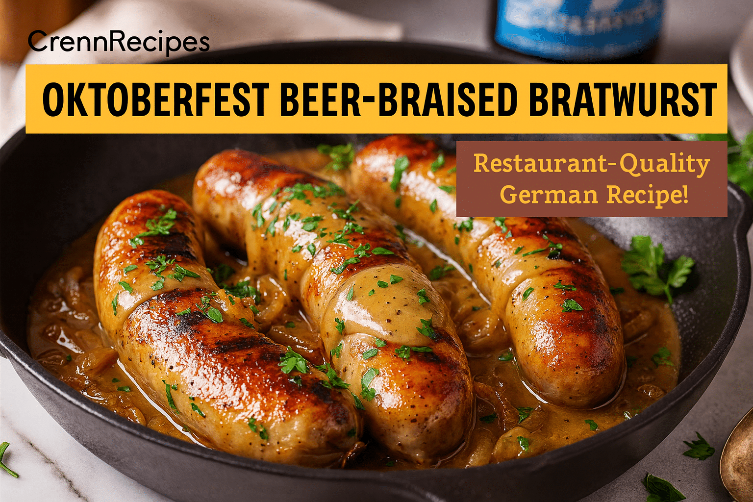 Authentic German Oktoberfest Beer-Braised Bratwurst with Spicy Mustard Cream combines traditional bratwurst sausages slowly cooked in Oktoberfest beer with caramelized onions and finished with a rich, tangy mustard cream sauce. Crafted for discerning home chefs seeking restaurant-quality German cuisine with authentic Oktoberfest flavors.