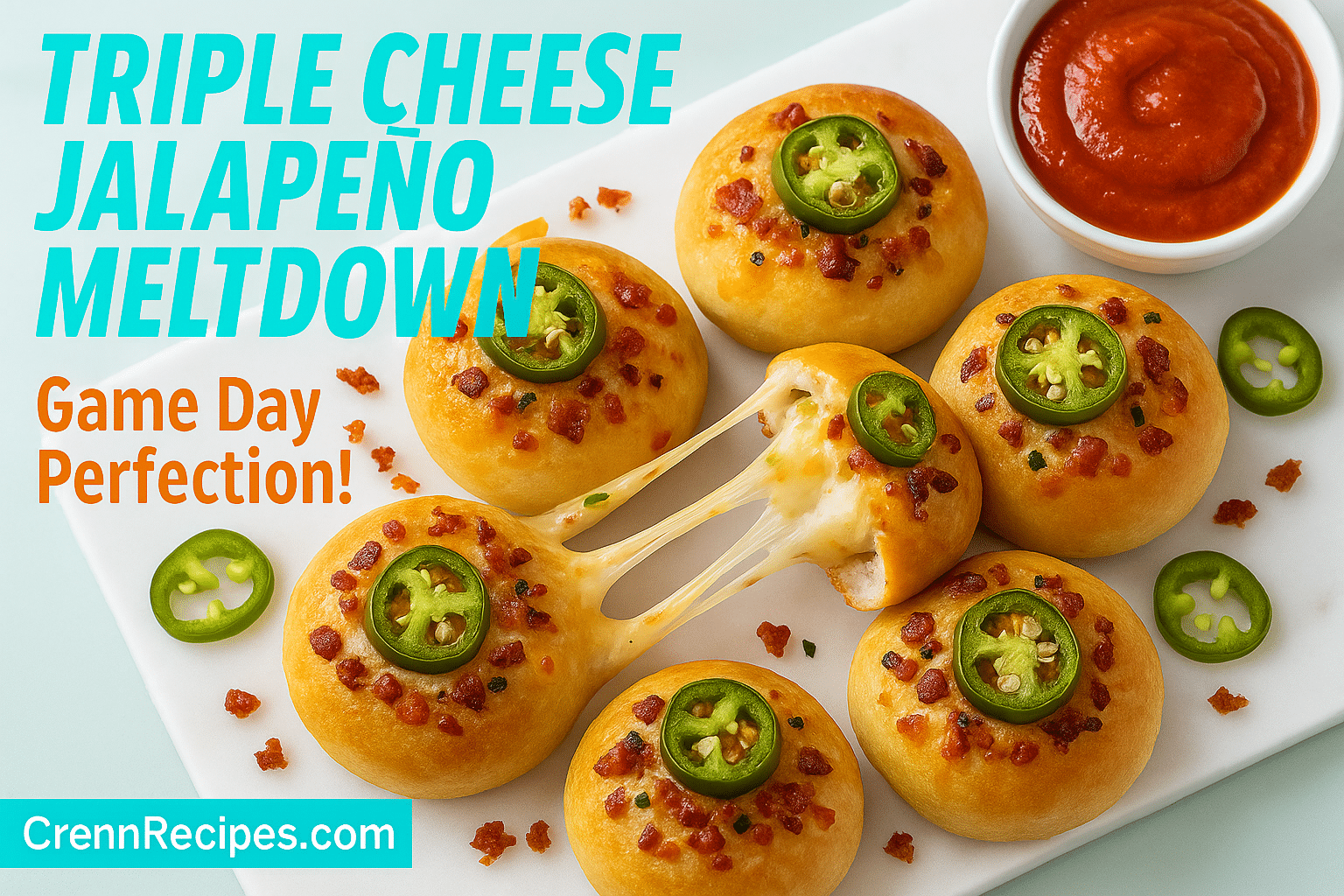 Triple Cheese Jalapeño Meltdown Pizza Bombs with melting mozzarella, cheddar, and pepper jack in perfectly sealed dough parcels. Crafted for discerning home chefs seeking game day perfection and party-ready appetizers.